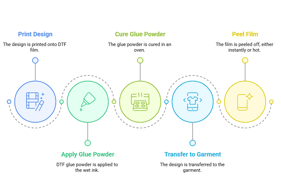 DTF (Direct to Film) lets you apply vibrant, high-detail designs to almost any fabric. We print your artwork on a special film, apply and cure adhesive powder, then heat-press it onto the garment and peel the film for a clean, durable finish.